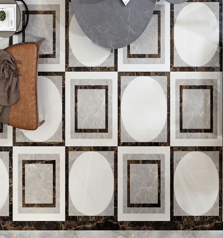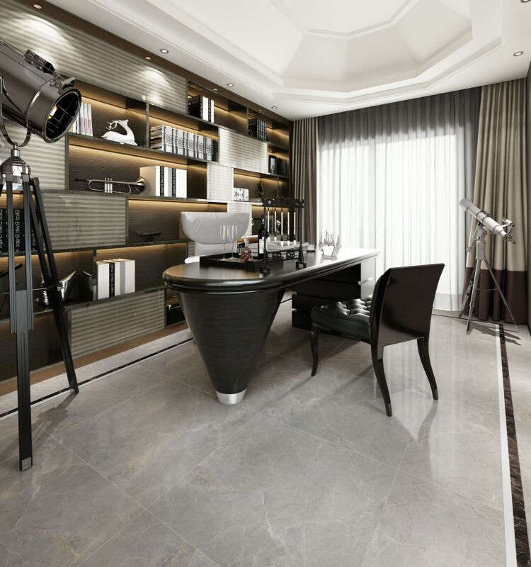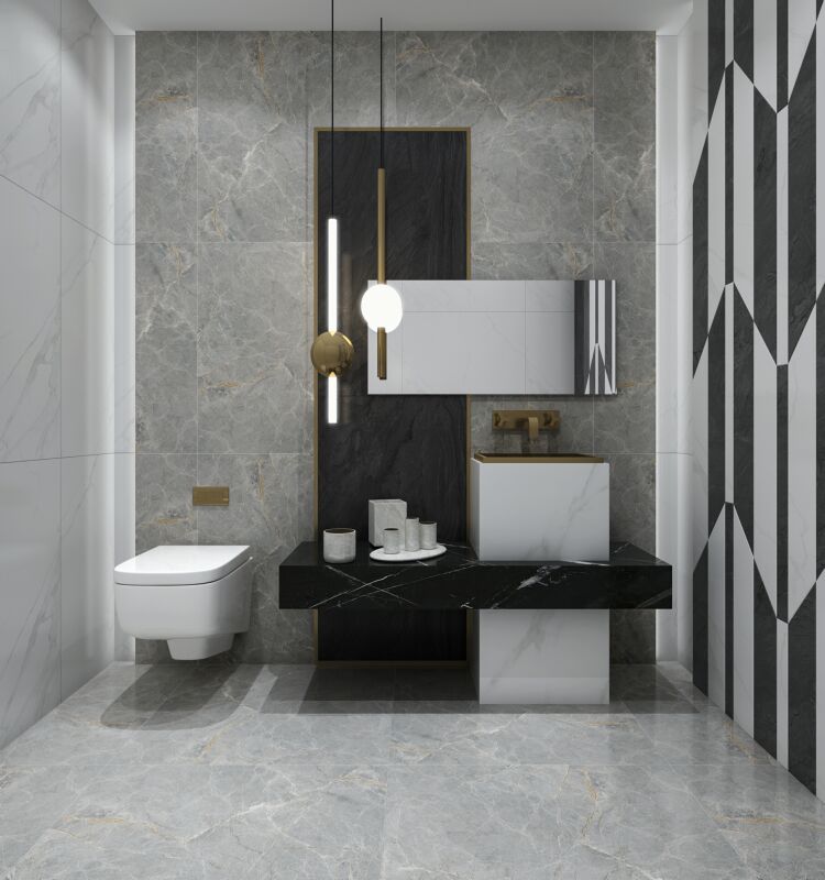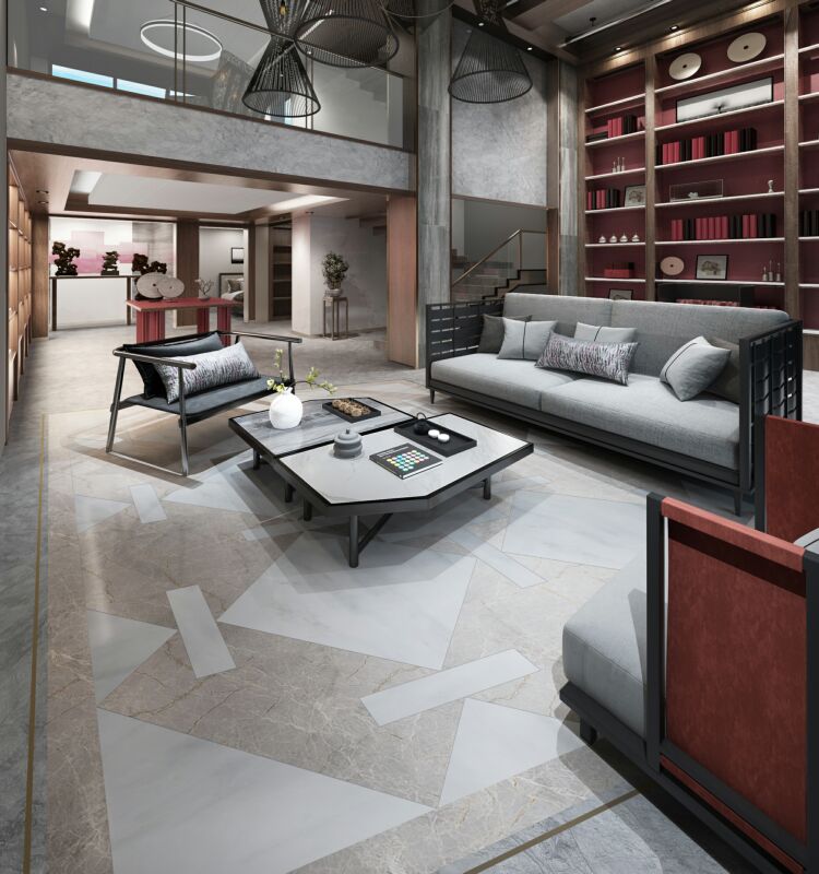 以時(shí)下流行的灰色搭配線(xiàn)條,層次分明,紛亂中自成一態(tài),灰與白的互相滲透和過(guò)渡,相輔相融,彰顯出石材的低調的奢華。